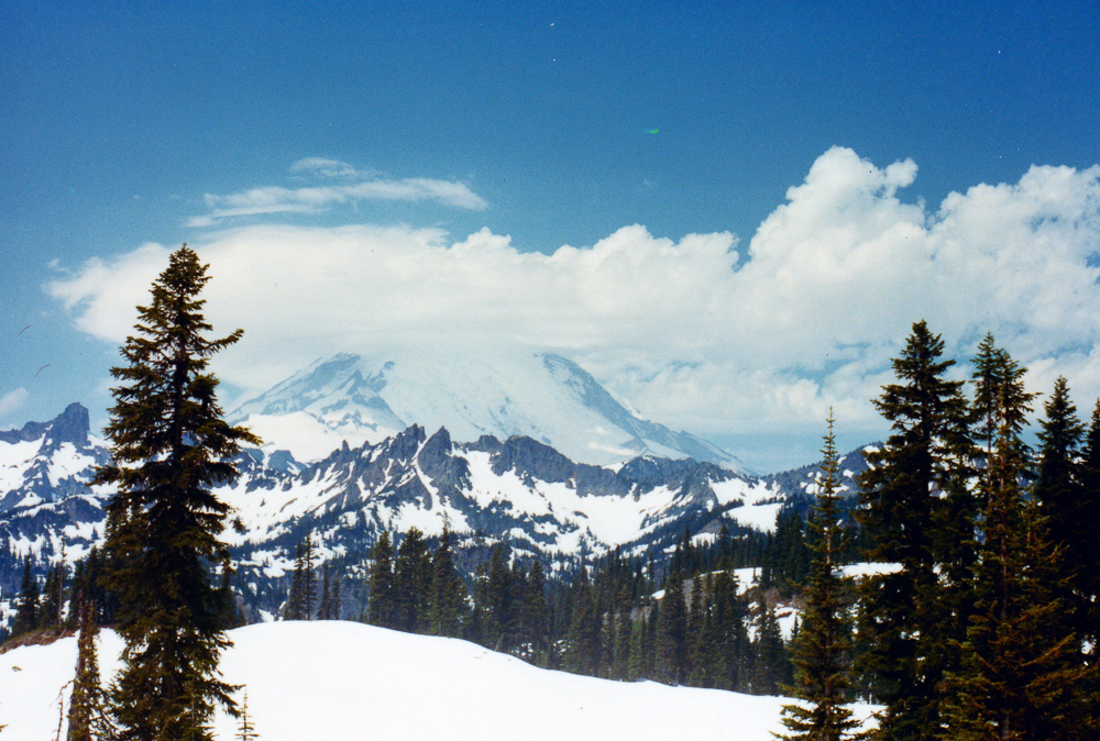 Mount Rainier has always been a special place for us. In our first years it was a green oasis from the heat and dust of the eastern Washington summers. We would drive through Yakima in the early morning and follow the Naches and American rivers on old highway 410 up to Chinook Pass. The road makes a constant climb over 4000 feet, with a final push hugging the side of a steep canyon. The mountain is barely visible from the river valleys so the first clear view of Rainier at the pass was startling. Even more so for a flatlander from the midwest. Kay grew up in Japan with the sense that Mount Fuji was a special place and it seemed that Fuji had followed her here in the guise of Rainier. Even when we lived elsewhere we would try to visit to energize our spirits. Now, for thirty-nine years we have been fortunate to have our mountain in the backyard, visible whenever the sky would clear. We hope you too will be able to experience Rainier on your visit even if only from a distance.